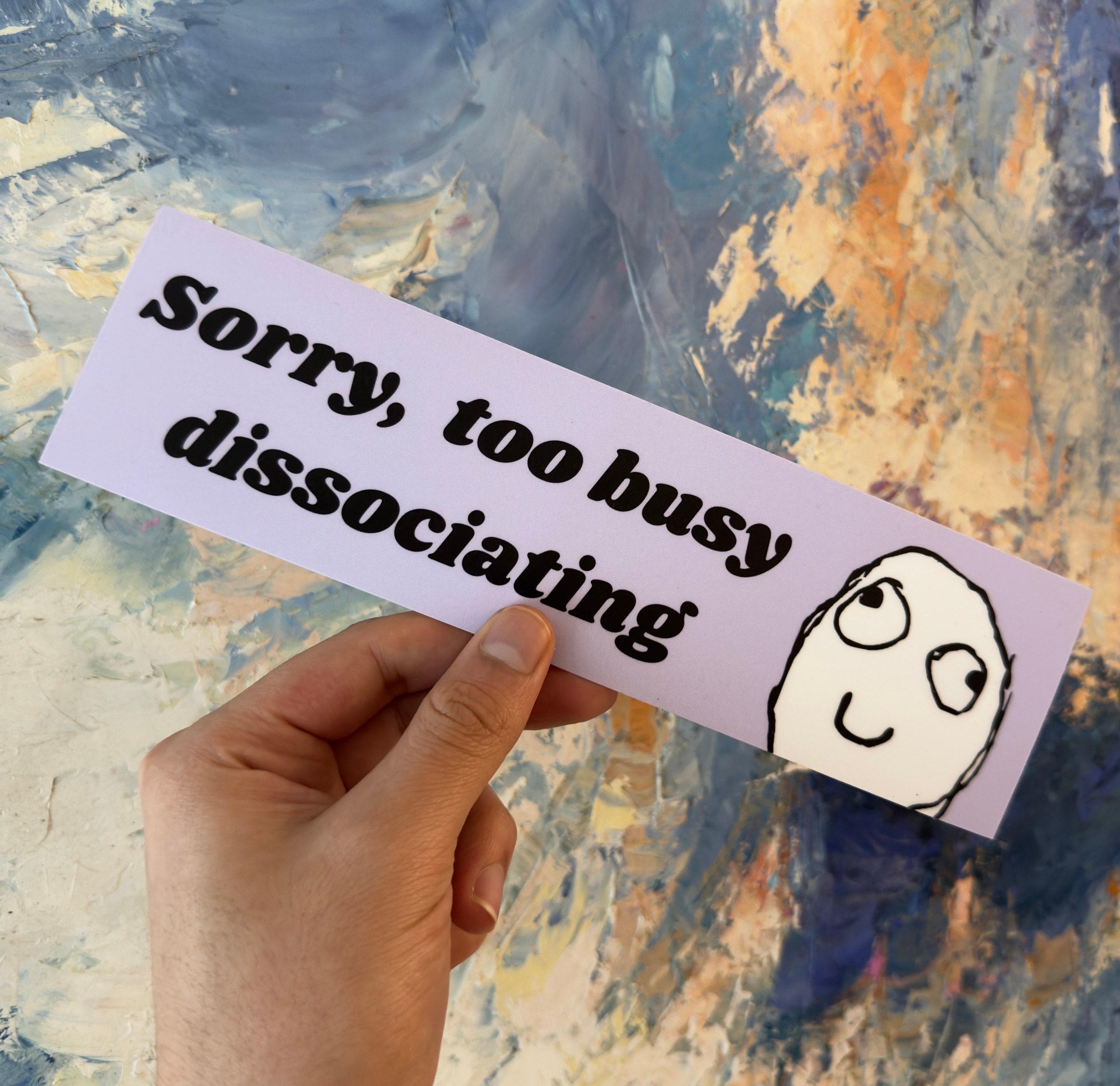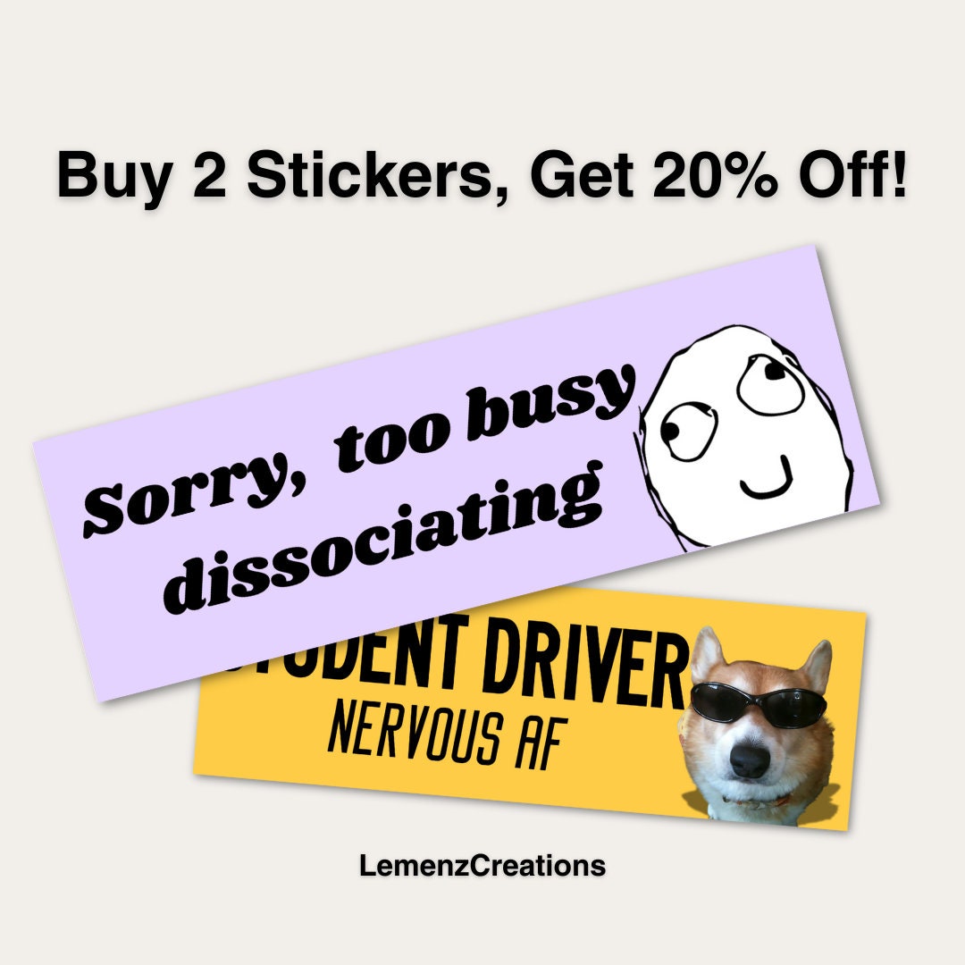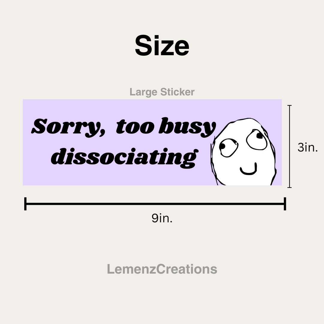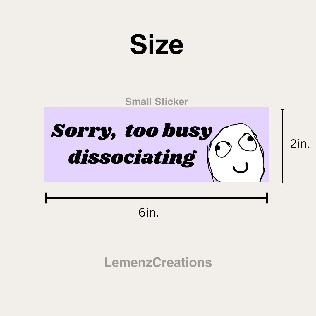 Bring a touch of humor and personality to your belongings with our "Sorry, Too Busy Dissociating" vinyl sticker, featuring a relatable meme face on the right side. Meticulously crafted from top-grade vinyl and finished with a matte laminate for enhanced durability, this sticker is not just a decoration but a statement of your individuality. Whether you're adorning your laptop, water bottle, car, or notebook, our stickers offer unparalleled quality and style. Ideal for any flat or curved surface, they make perfect gifts and are loved by customers worldwide.