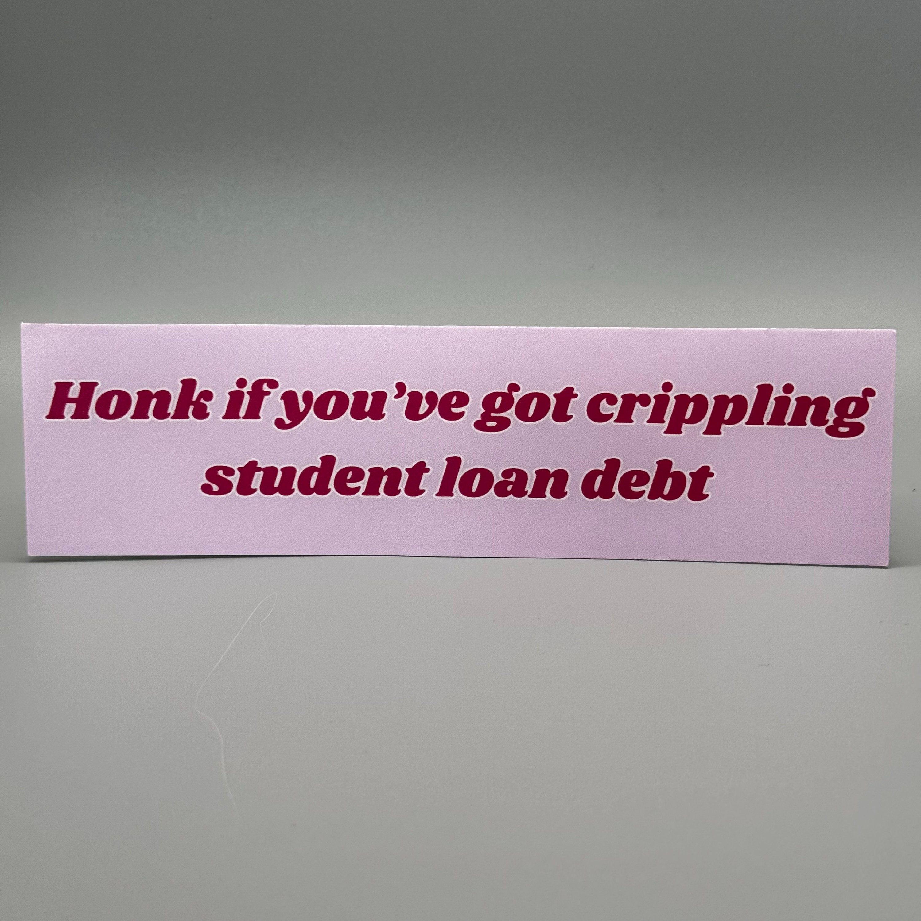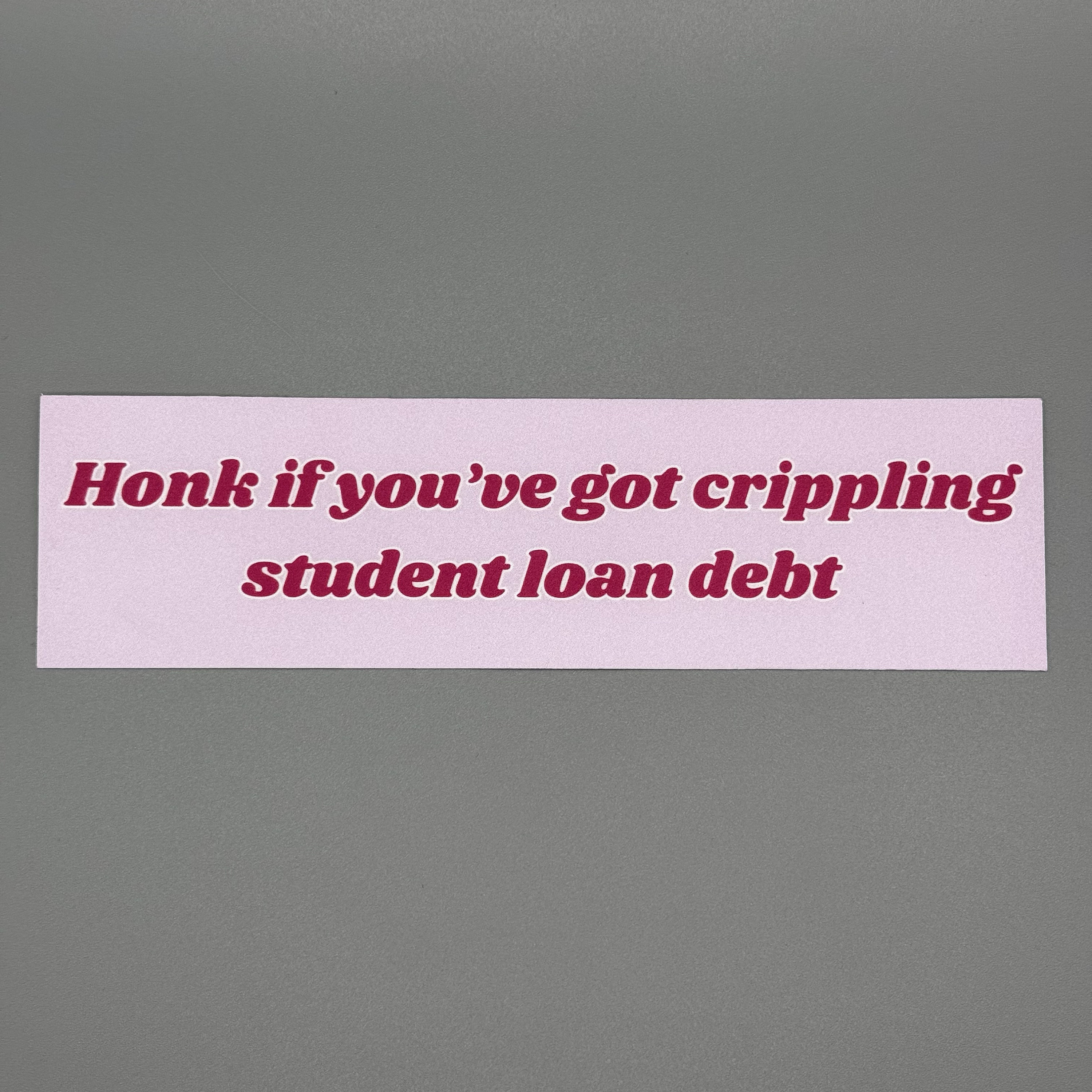 Make a statement about the realities of student loans with our bold sticker that reads 'Honk if you've got crippling student loan debt'. Perfect for anyone looking to add a touch of humor and social commentary to their car or laptop!