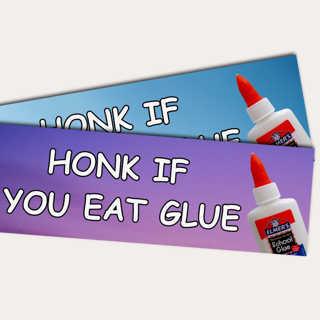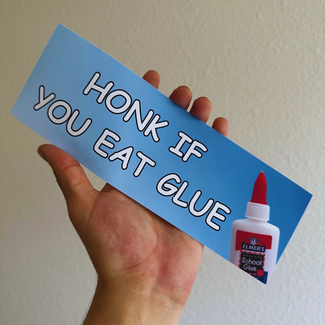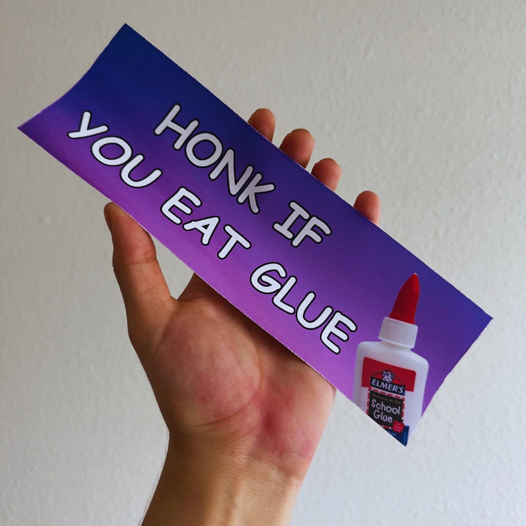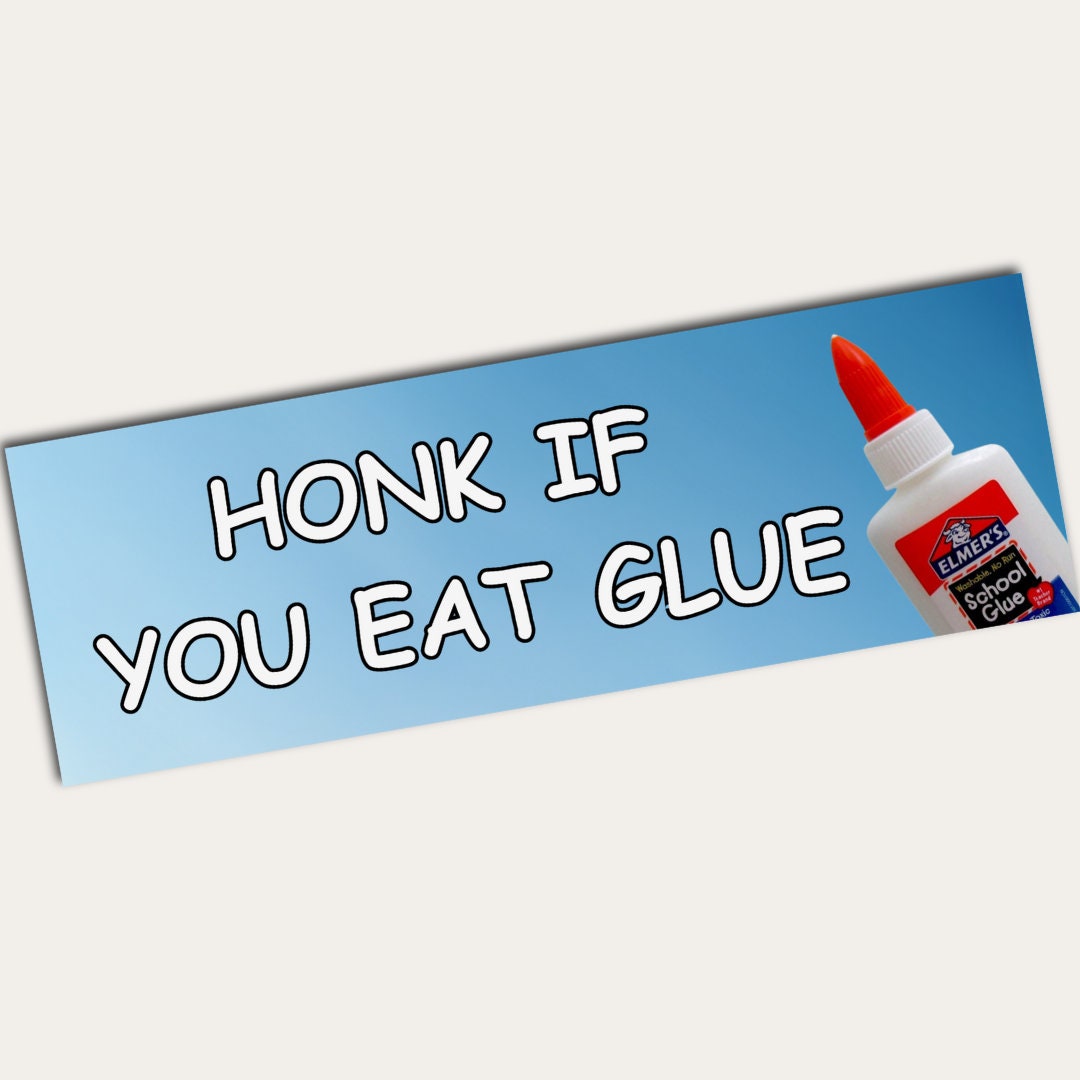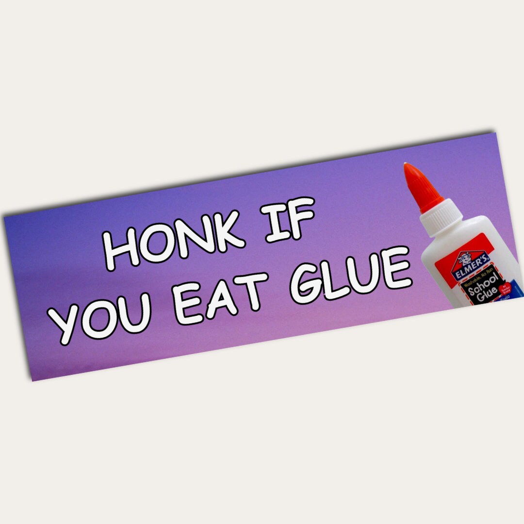 Make your ride stand out with this hilarious "Honk if You Eat Glue" bumper sticker! Perfect for adding a touch of humor to your car, truck, or van, this vinyl decal is sure to get a laugh from fellow drivers. Whether you're looking for a funny gift for a friend or just want to add some personality to your vehicle, this sticker is the perfect choice.