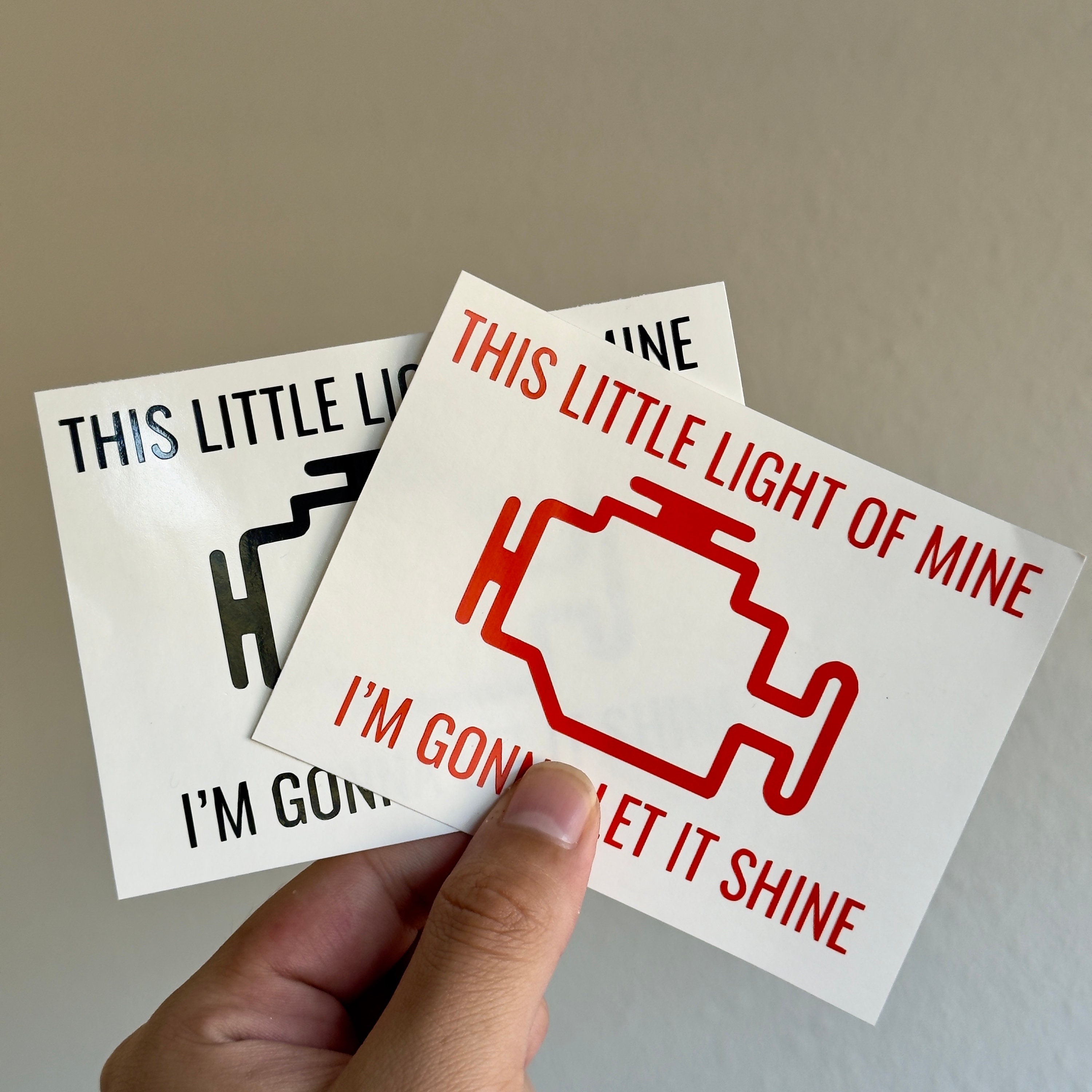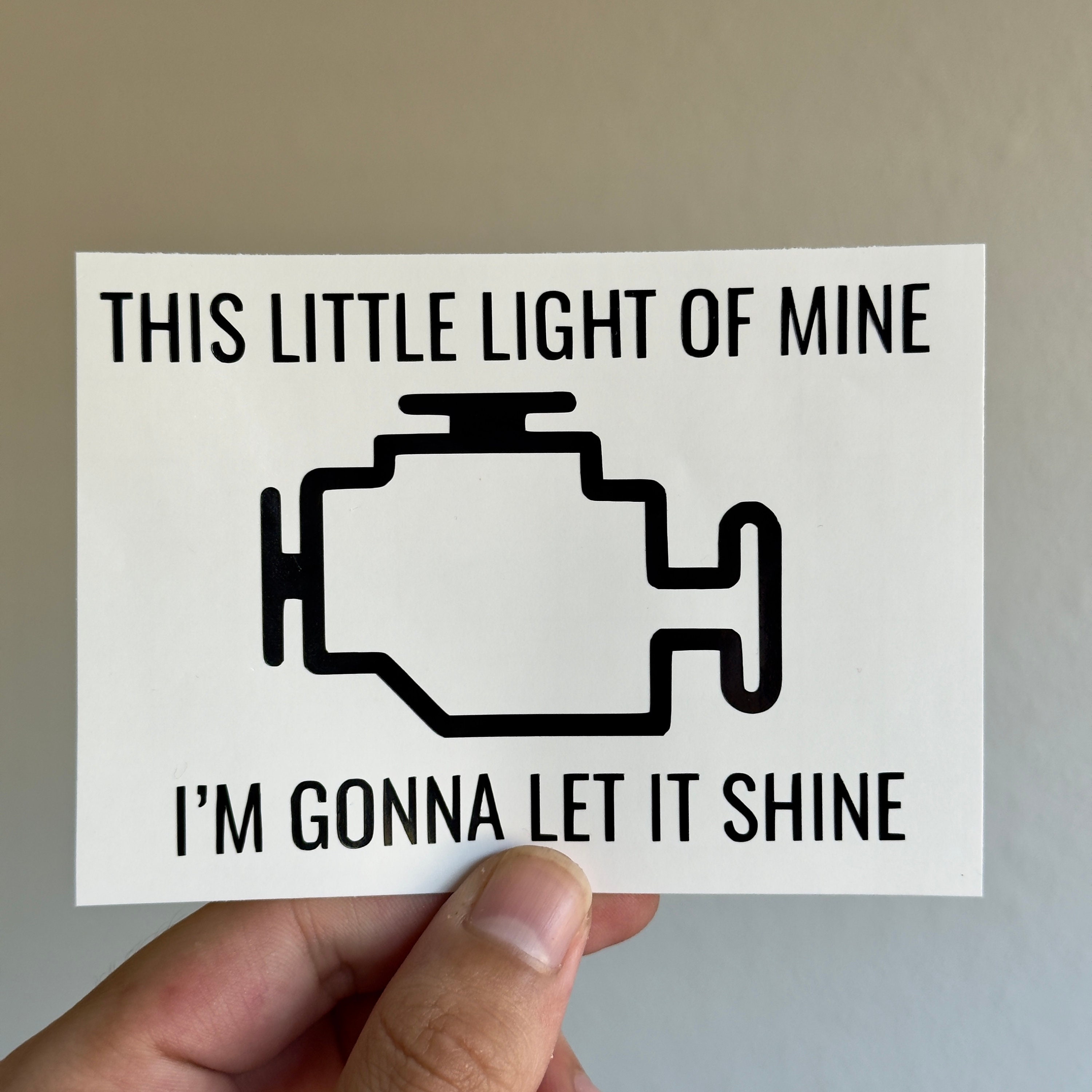 Turn heads and spark smiles with our funny "This Little Light of Mine" check engine light decal. Featuring the playful phrase 'This little light of mine, I'm gonna let it shine' alongside a cheeky car check engine light icon, this decal is perfect for adding a humorous touch to your vehicle or any smooth surface.