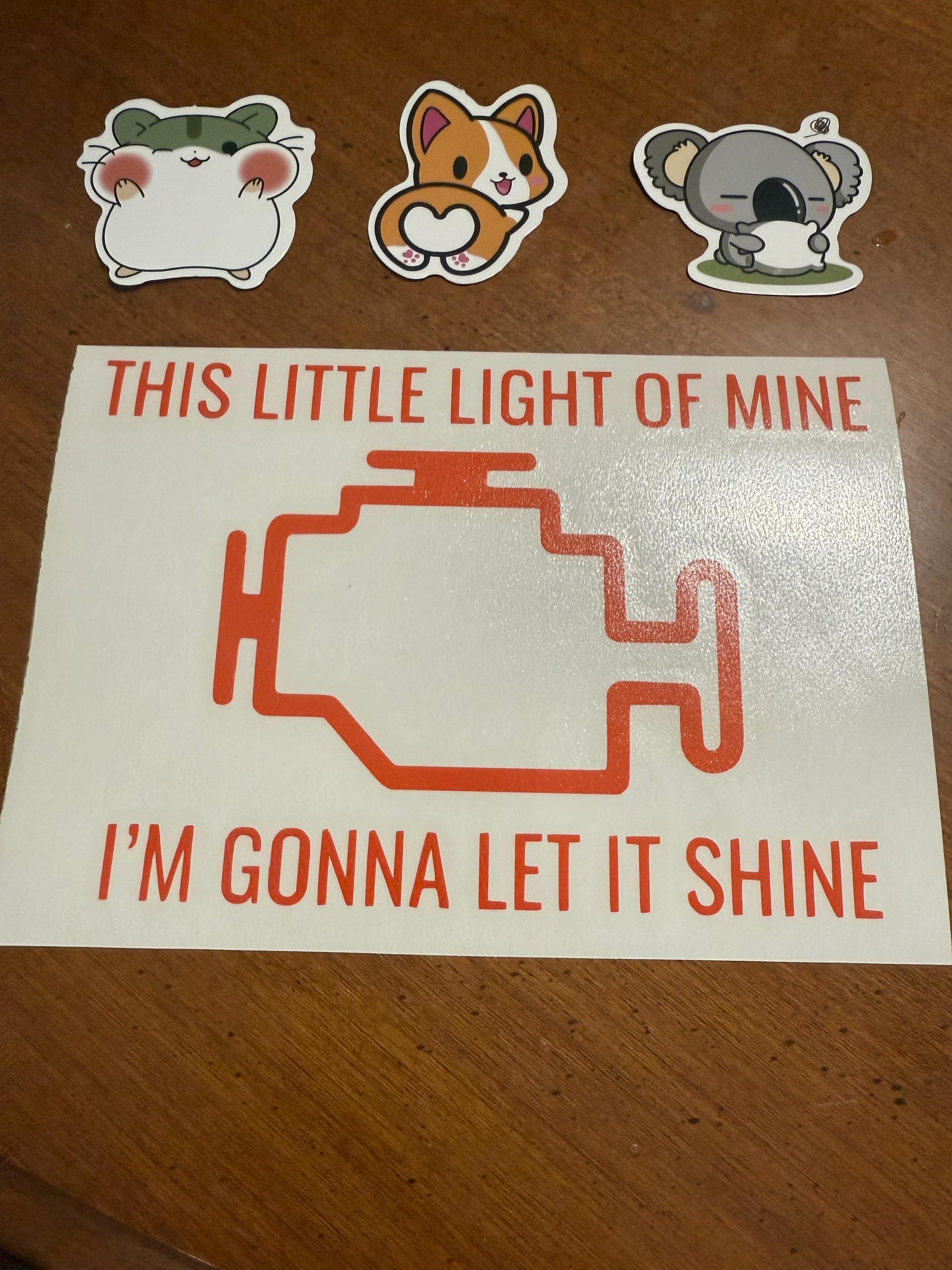 Turn heads and spark smiles with our funny "This Little Light of Mine" check engine light decal. Featuring the playful phrase 'This little light of mine, I'm gonna let it shine' alongside a cheeky car check engine light icon, this decal is perfect for adding a humorous touch to your vehicle or any smooth surface.